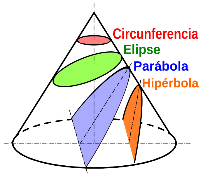 Se denomina sección cónica (o simplemente cónica) a todas las curvas resultantes de las diferentes intersecciones entre un cono y un plano; si dicho plano no pasa por el vértice, se obtienen las cónicas propiamente dichas. Se clasifican en cuatro tipos: elipse, parábola, hipérbola y circunferencia.